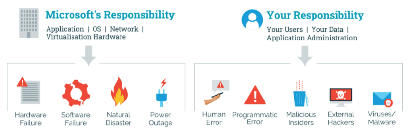 So who is responsible for what? This can vary depending on the platform but typically the provider is responsible for physical security of the data centers and softwares. This means that the provider must protect the users’ data from hardware failures, software failures, natural disasters and power outages to name a few. The user’s responsibility is to protect the data from ransomware, human error, internal and external security threats as well as programmatic issues.